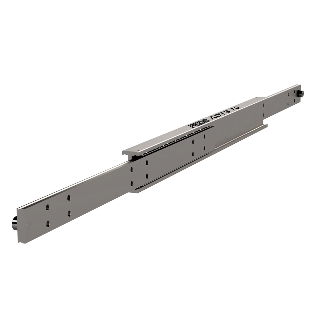 The ADTS-70 slide is designed for lightweight applications in wet environments such as fire truck pump carriers where steel slides corrode. The ADTS-70 with a 330kg loading over 600mm is suitable for vehicle mounted drawer systems where corrosion and weight is an issue. There is a significant weight reduction in a Fire Rescue Unit which has up to 32 drawers. This compliments our non-corrosive tilting drawer systems and handle locks. A single ADTS-70 weighs 5.44kg per metre.