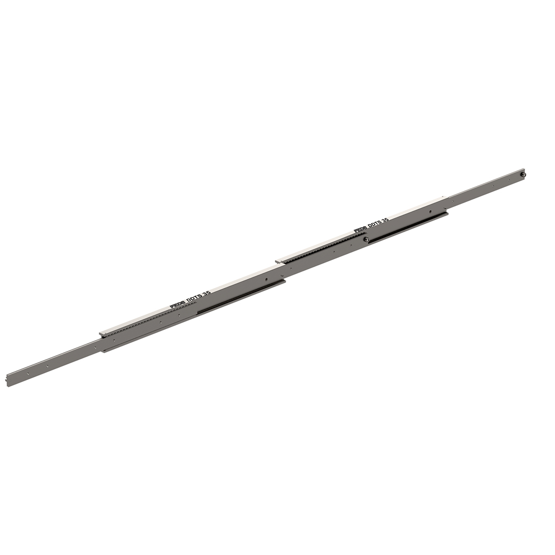 The DDTS-35 slide with a closed length of 350mm has a travel of 700mm (1,050mm overall) with a loading of 100 kg per fully extended pair. Constructed from 5 cold drawn steel sections this full action ball bearing slide has high precision and excellent level of resistance to shock and vibration when supporting a static load in the closed position. Accordingly, this slide is well suited to mounting on vehicles. This is a very strong compact slide, utilising the I beam format, which offers high resistance against axial and coaxial torque loading. Resulting in minimal deflection at full extension and low operating forces.