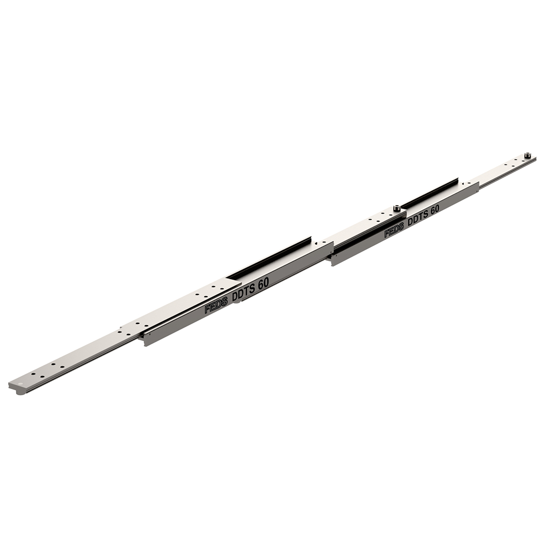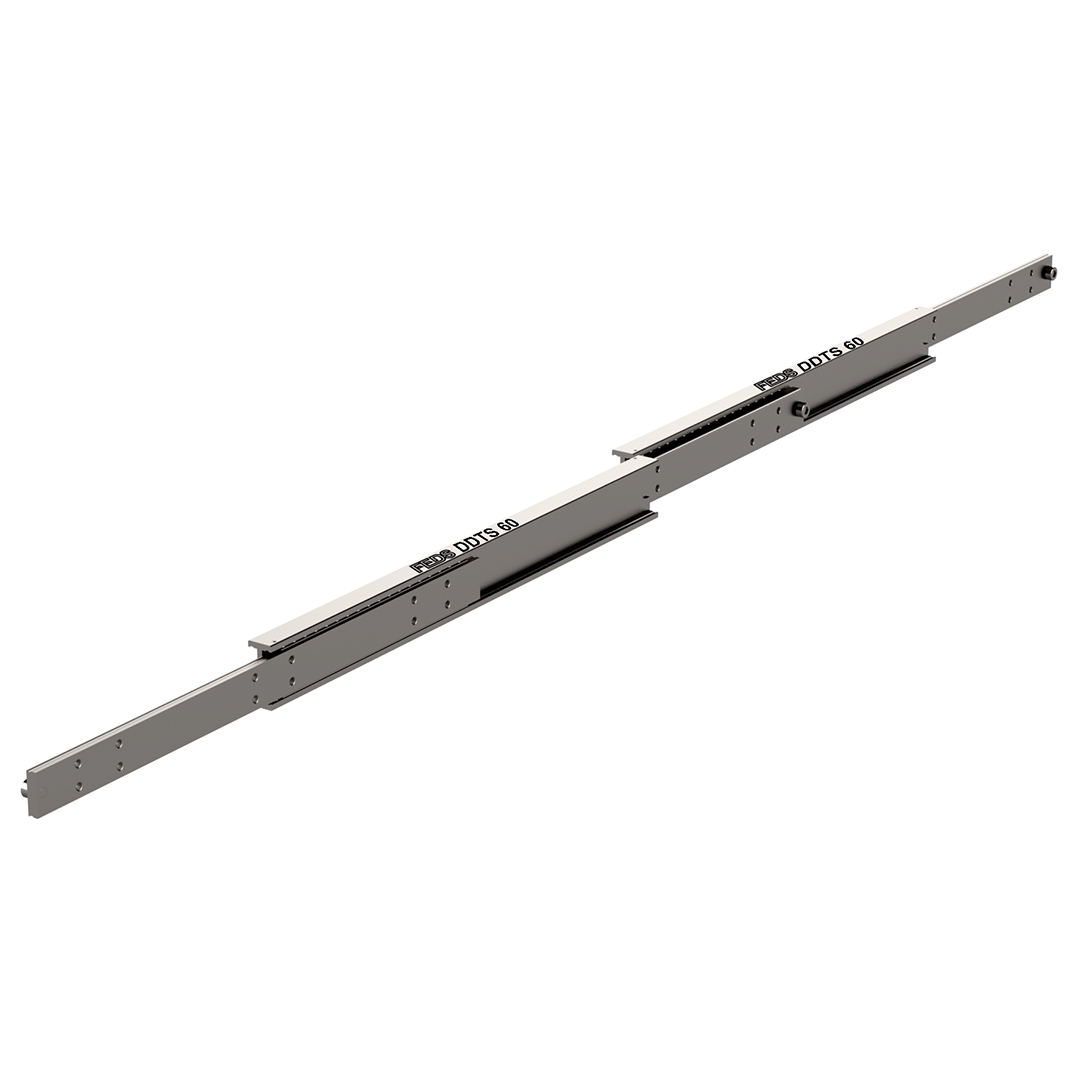 The DDTS-60 slide with a closed length of 600mm has a travel of 1,200mm (1,800mm overall) with a loading of 320 kg per fully extended pair. Constructed from 5 cold drawn steel sections this full action ball bearing slide has high precision and excellent level of resistance to shock and vibration when supporting a static load in the closed position. Accordingly, this slide is well suited to mounting on vehicles. This is a very strong compact slide, utilising the I beam format, which offers high resistance against axial and coaxial torque loading. Resulting in minimal deflection at full extension and low operating forces.