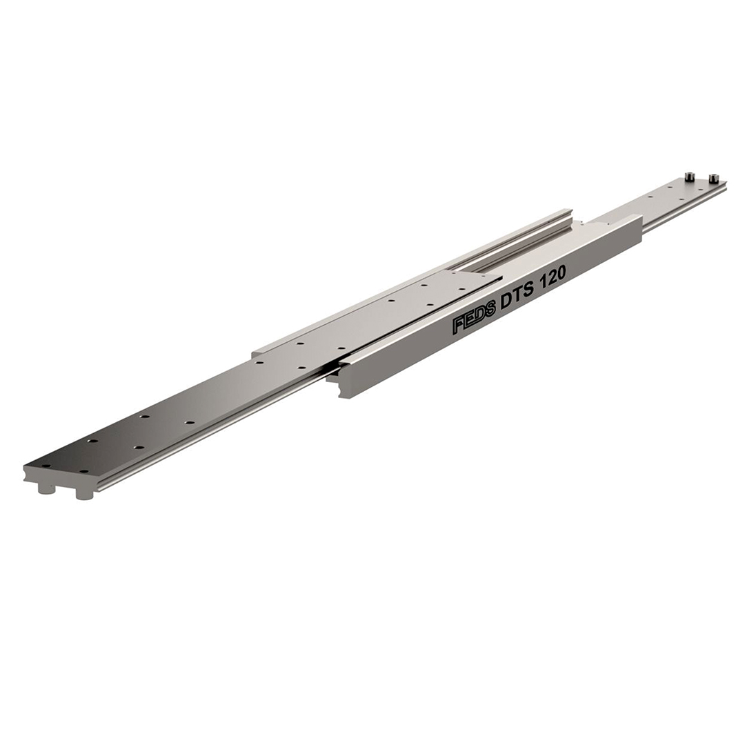 The DTS-120 is a rugged, strong and very compact telescopic slide, which has been designed for load maximisation from a narrow space envelope. Particularly suited to material handling, military container pods and long access platforms for aircraft wing maintenance, it has a wide range of applications where torsional strength is paramount. This is a full range slide, with standard lengths from 300mm to 3,000mm.
