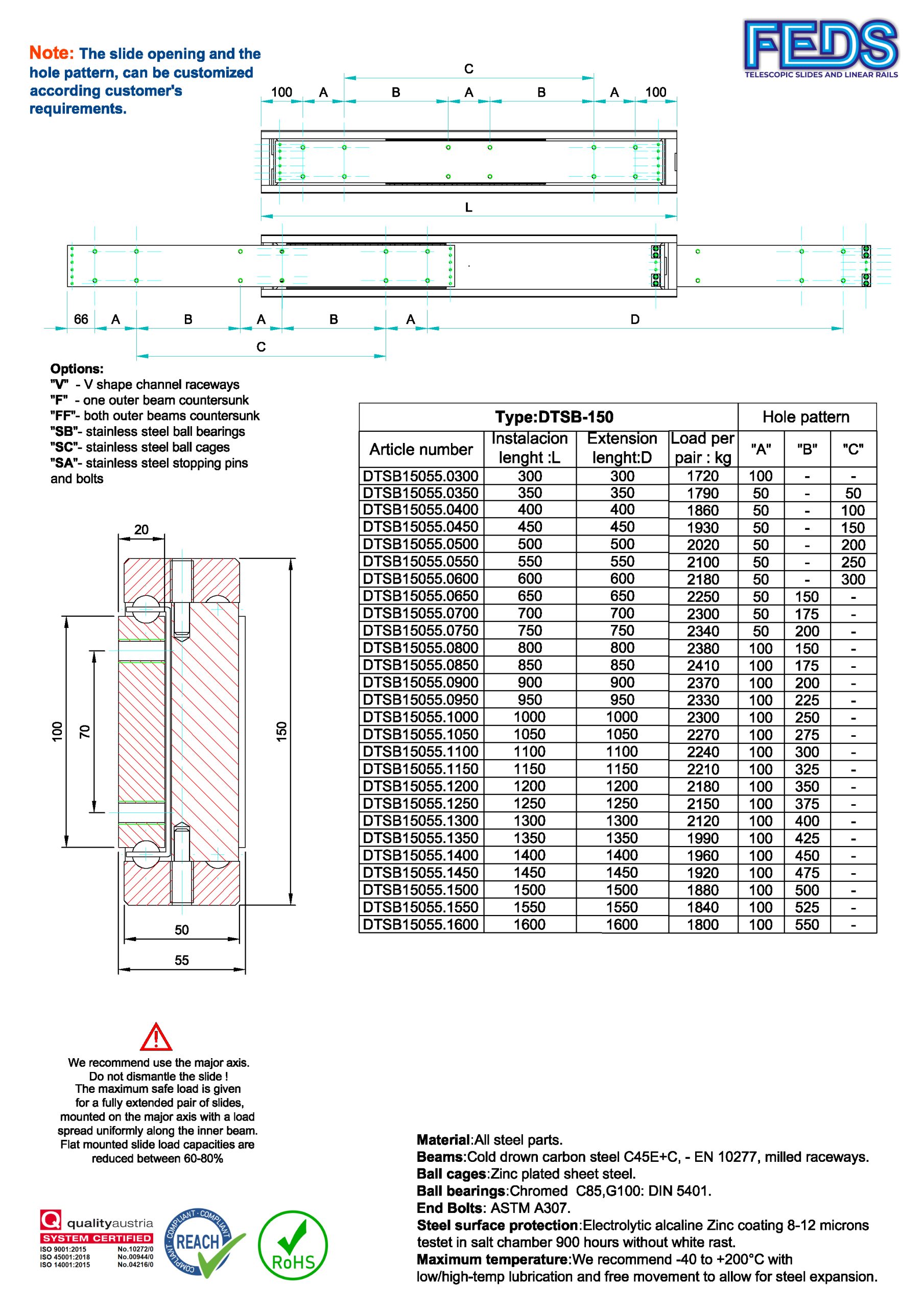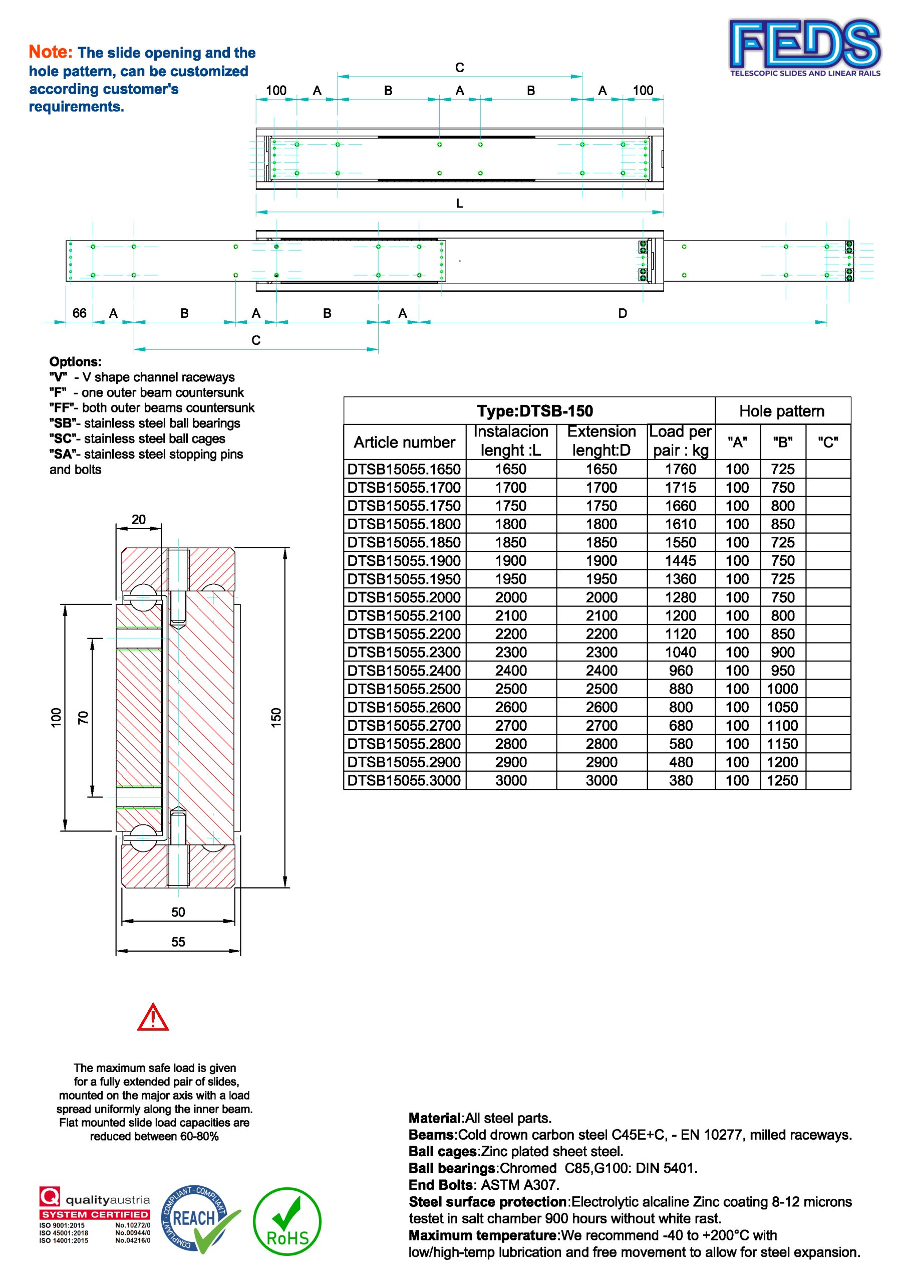 FEDS DTSB-150 | 380 - 2410 Kg telescopic slide steel C45