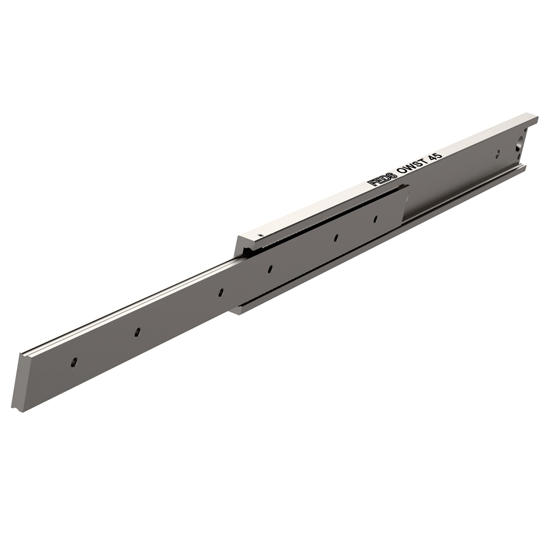 The slides are manufactured from cold drawn steel C45E+C in accordance with EN 10277. Standard ball cages are manufactured from zinc plated sheet metal, and the ball bearings are carbon steel C85 G100 in accordance with DIN 5401. A single OWST-45 weighs 3.41 kg per metre.