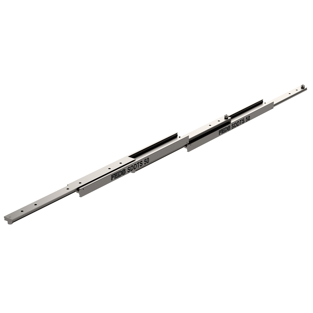 The SDDTS-50 slide with a closed length of 500mm has a travel of 1,000mm (1,500mm overall) with a loading of 110 kg per fully extended pair. Constructed from milled stainless steel sections, with machined ball tracks for accuracy, it has excellent levels of shock and vibration resistance. Accordingly the product is well suited to rugged defence and marine applications. The slide beams, cages and ball bearings are manufactured from austenitic grade 316L (1.4404). End stop bolts and retaining pins are austenitic grade 304 (1.4301), completing the corrosion protection, There is the bespoke option to manufacture an all 316L product on higher production volumes.