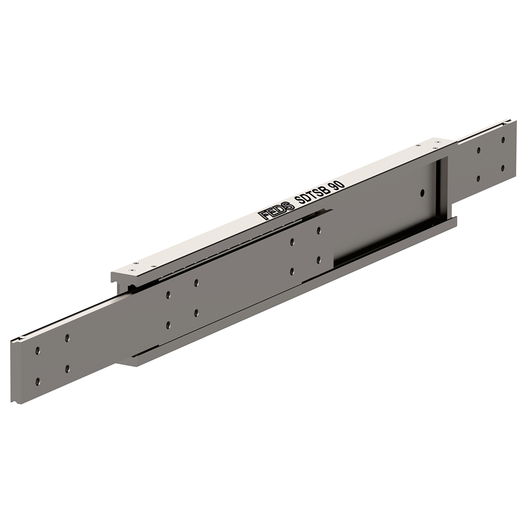 The SDTSB-90 offers total extension front and rear. This is made possible by an internal rocker device which releases each beam in sequence. Ideal for thru-truck drawers, or mid-mounted train battery rafts, where access from either side may be limited.
