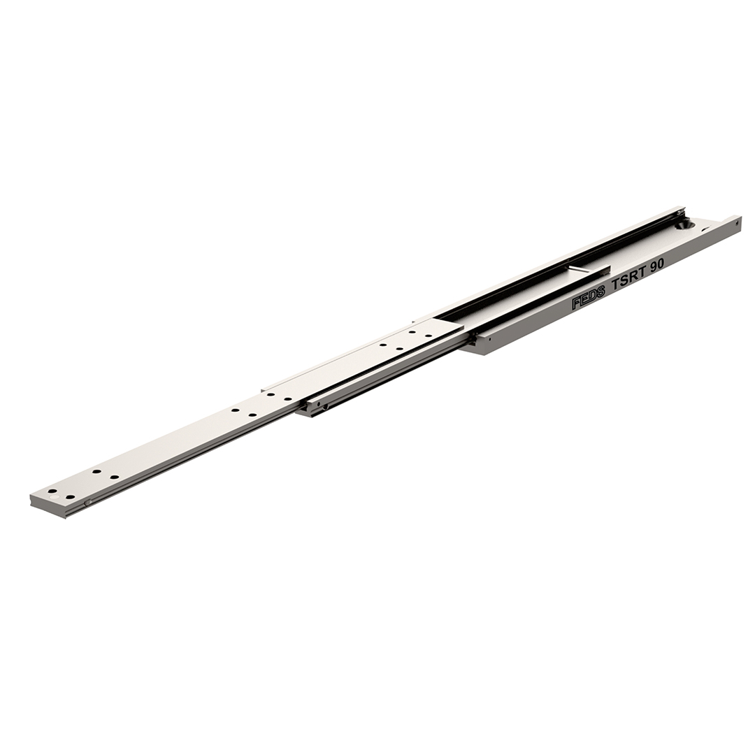 The TSRT-90 is an extreme load/duty 100% extension slide (190-690 kg/pair). At 550mm, 1 pair has a travel of 550mm to the front and to the rear, with a load capacity of 670 kg. Constructed from cold drawn steel sections and precision milled ball tracks, this is a very strong compact slide, which offers high resistance against axial and coaxial torque loading. Resulting in minimal deflection at full extension and low operating forces throughout the traverse.